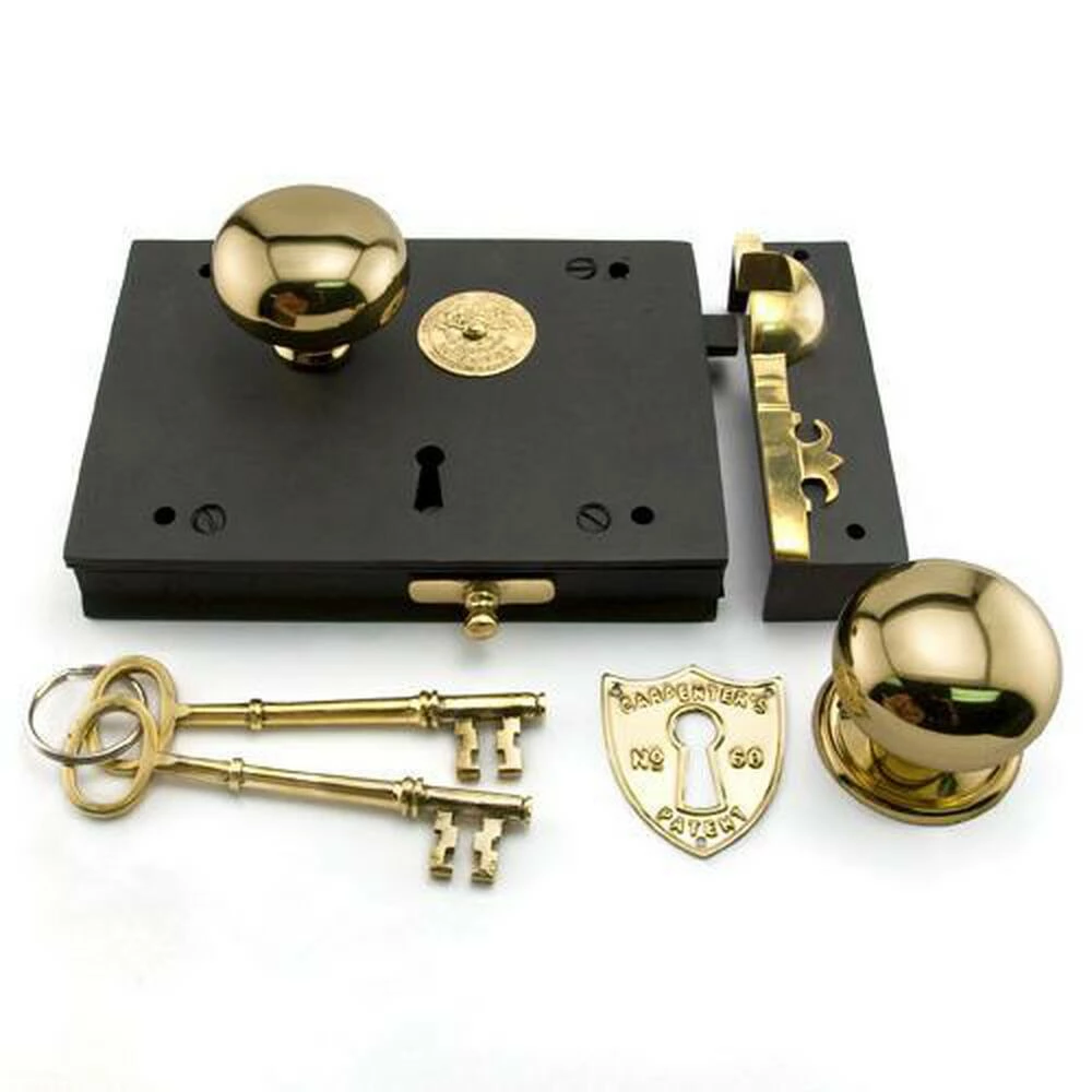 Signature Hardware Carpenter’s Brass Rim Lock Set with Brass Knobs Left Hand in Polished Brass