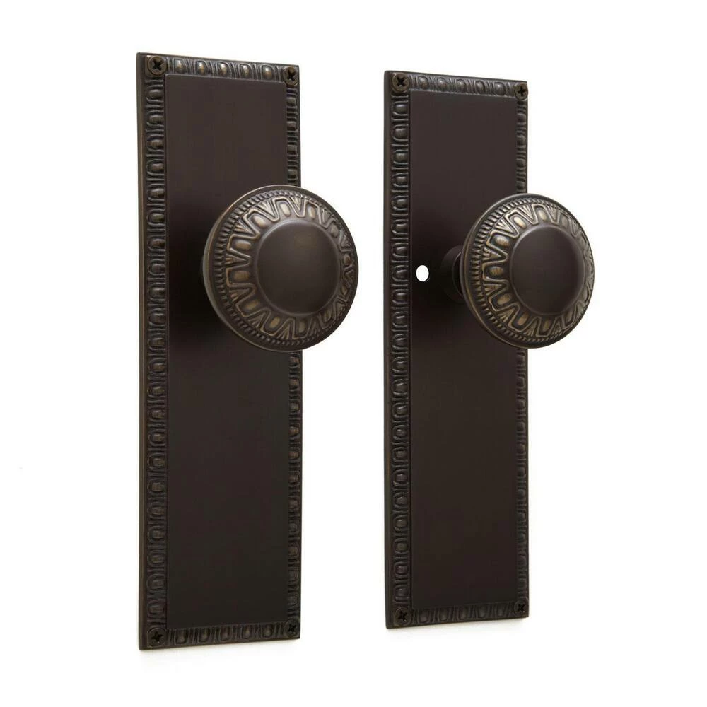 Signature Hardware Egg & Dart 8-1/4 in. Brass Privacy Door Set Knob 2-3/8 in. Backset in Antique Brass